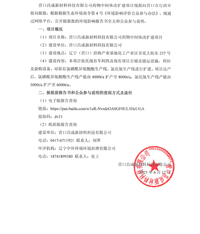 營口昌成新材料科技有限公司藥物中間體改擴(kuò)建項(xiàng)目環(huán)境影響評(píng)價(jià)公示(報(bào)批前公示)