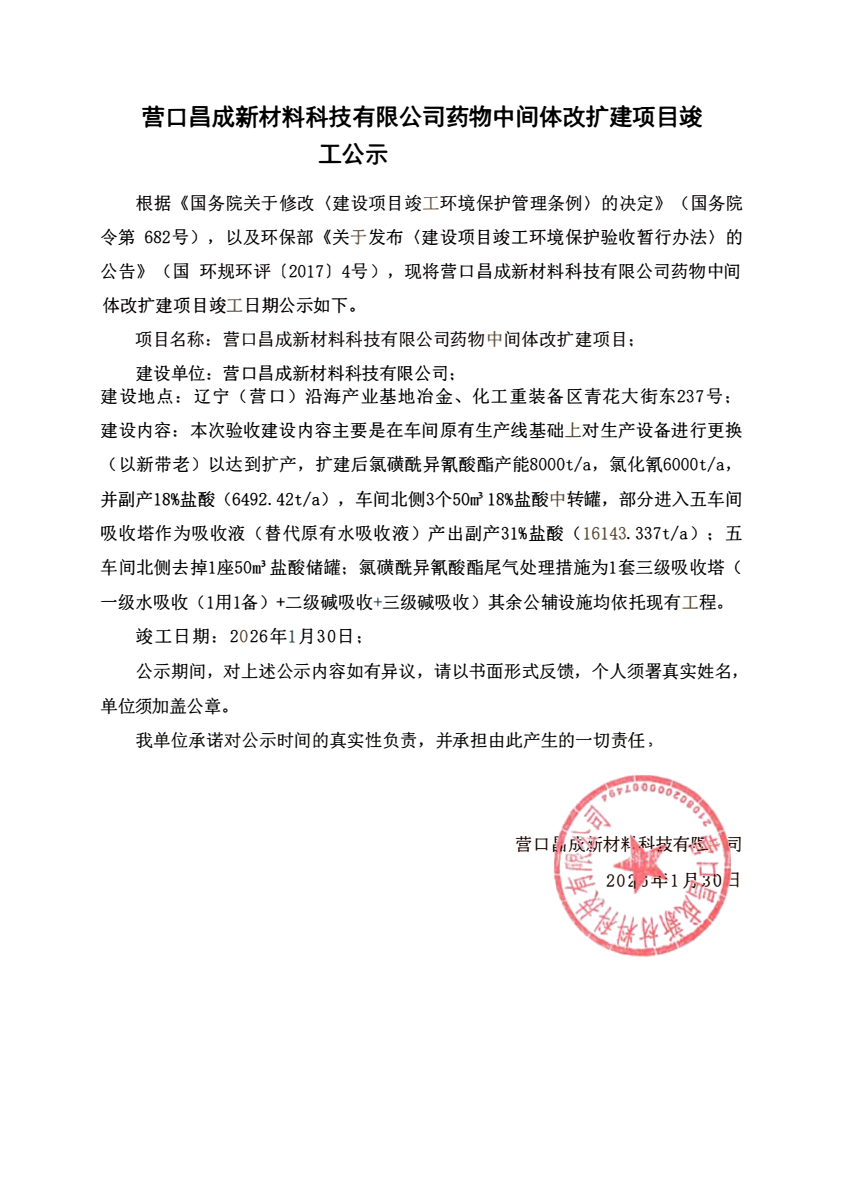 營口昌成新材料科技有限公司藥物中間體改擴(kuò)建項目竣工公示